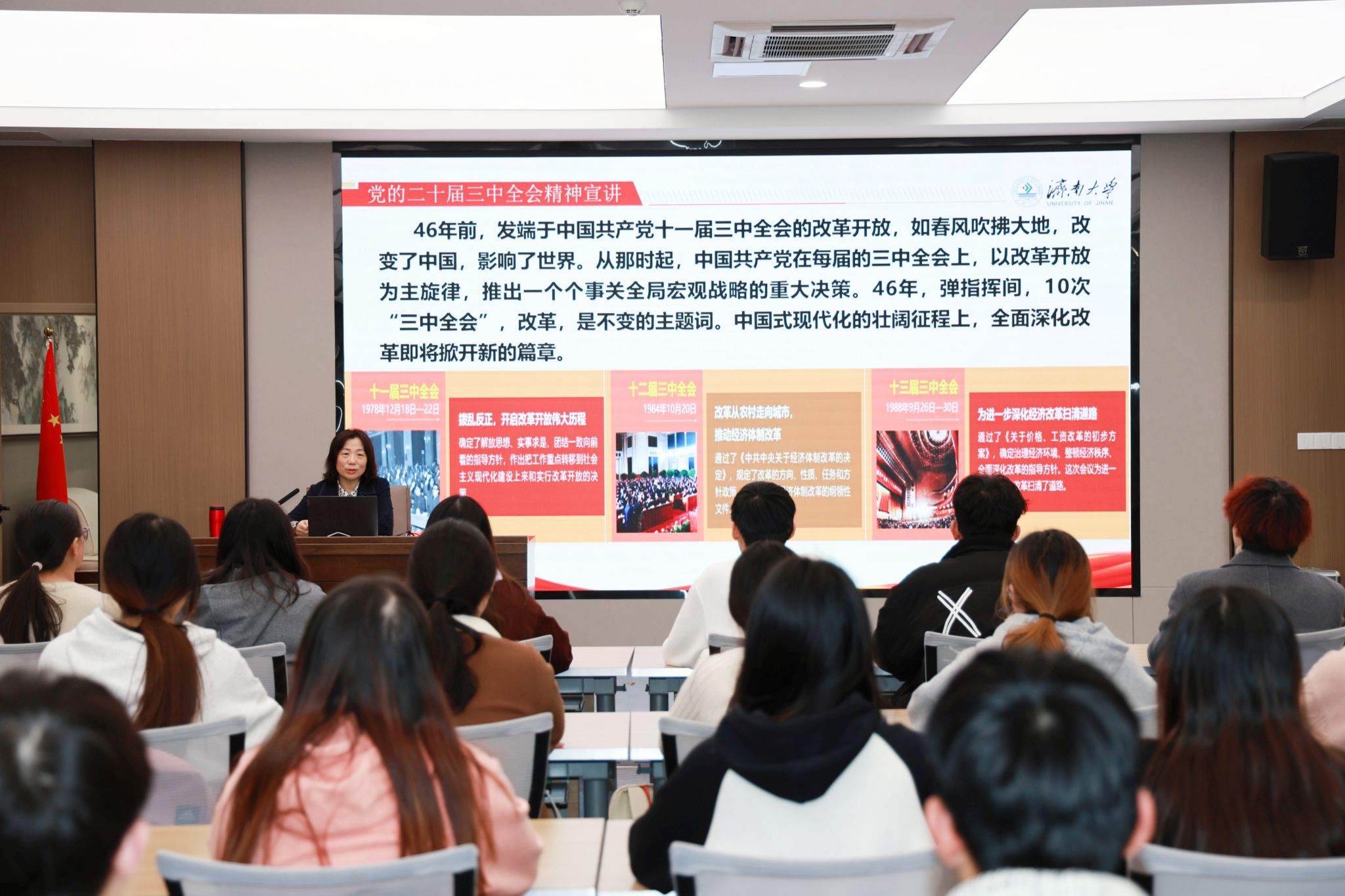 王霞带领大家回顾了改革开放以来历届党的“三中全会”的重要改革内容,并讲解了党的二十届三中全会的重大历史意义,引导青年学生将所学的专业知识与党的二十届三中全会精神进行深度融合,深刻领悟“改革浪潮有召唤,青年奋进正当时”之真谛,强化新时代青年不断向好发展的精神动力。从巴黎奥运感动十大瞬间谈起,指出奥运精神不仅是一种体育精神,更是一种生活态度,鼓励学生从奥运冠军的榜样力量中感悟意义,让奥运精神鼓励我们青年学生追求卓越,不断挑战自我。运用鲜活数据对比对新中国七十五载的辉煌成就进行了系统讲解,并围绕科技强国、文化自信等问题与学生开展互动交流,勉励同学们要在推进强国建设、民族复兴伟业中展现青春作为、彰显青春风采、贡献青春力量。最后从平安济大建设方面,教育学生时刻绷紧安全这根弦,提高学生安全防范意识,以“平安永驻”的美好愿景,共筑安全防线。