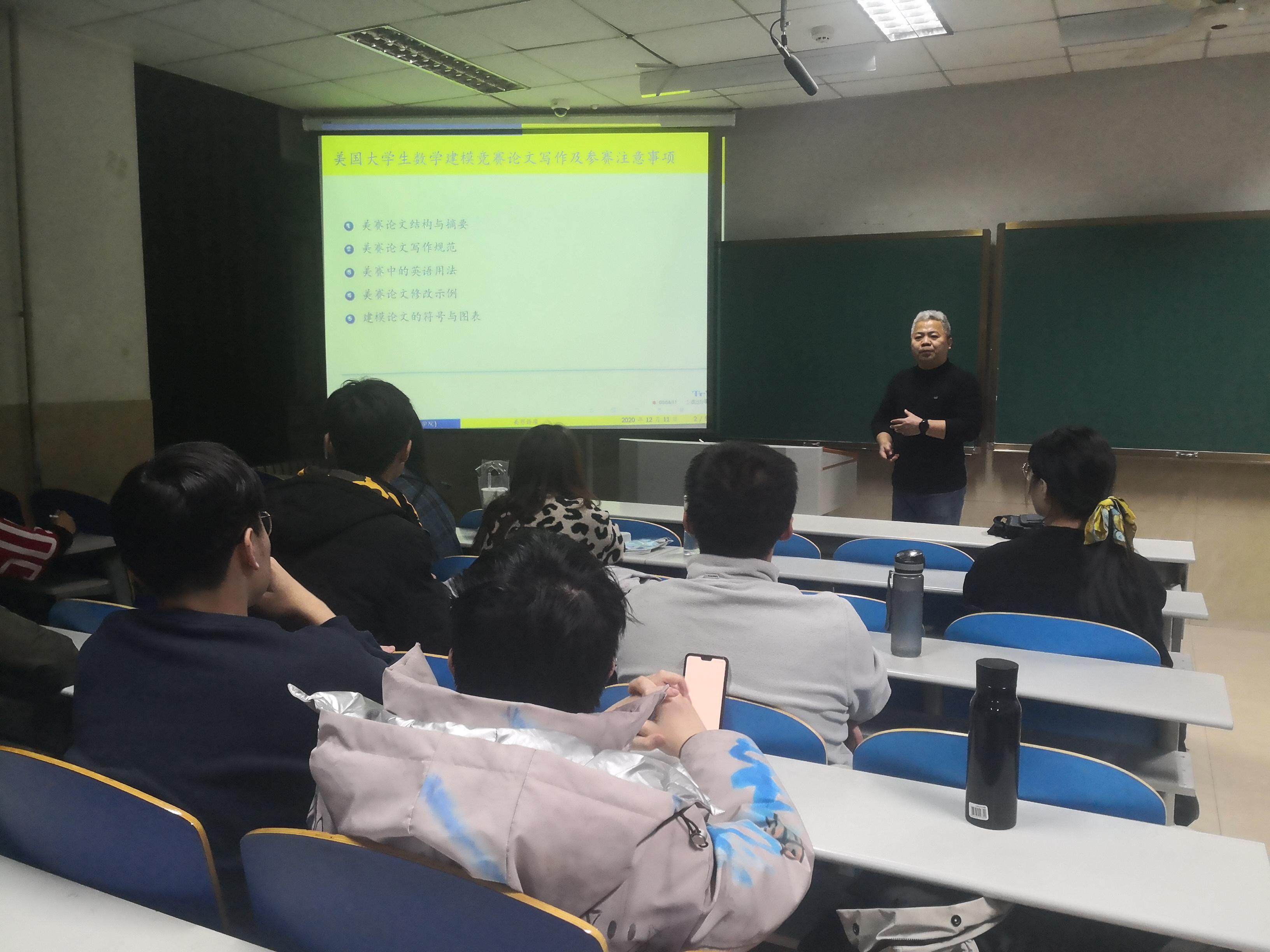 王新增老师首先介绍了建模竞赛论文的写作要点及英语论文的写作规律,然后介绍了美赛的特点及评阅方法,最后从竞赛准备、选题、写作等方面介绍了参赛注意事项,时长两个半小时。王老师的报告深入浅出,贴近学生,诙谐幽默,引人入胜,使听众在不知不觉中听完了报告。通过报告会,学生们明确了该如何准备美国大学生数学建模竞赛,消除了困惑,增强了信心。