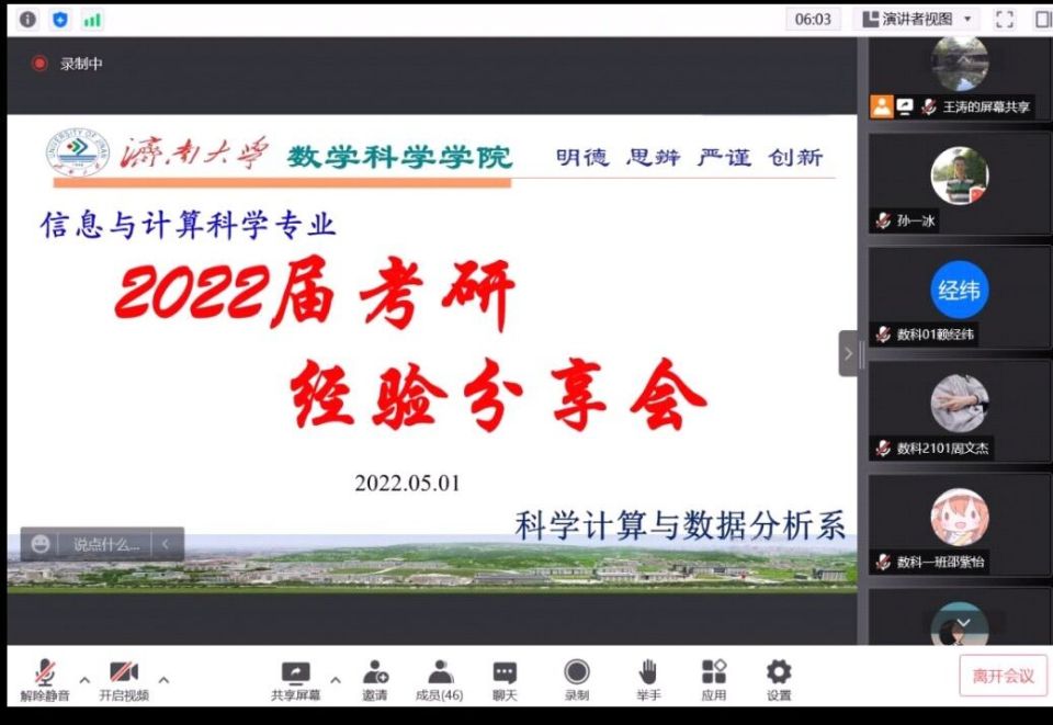 数据科学系召开了线上考研经验分享交流会,会议由王涛老师主持,邀请副院长靳绍礼老师、19级辅导员房琳琳老师和2022届部分研究生考试拟录取学生参加。