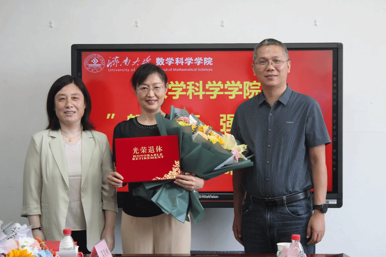 党委书记崔英静、院长孙元功为退休教师李新颁发荣休证书,青年教师代表为老教师献花并合影留念。
