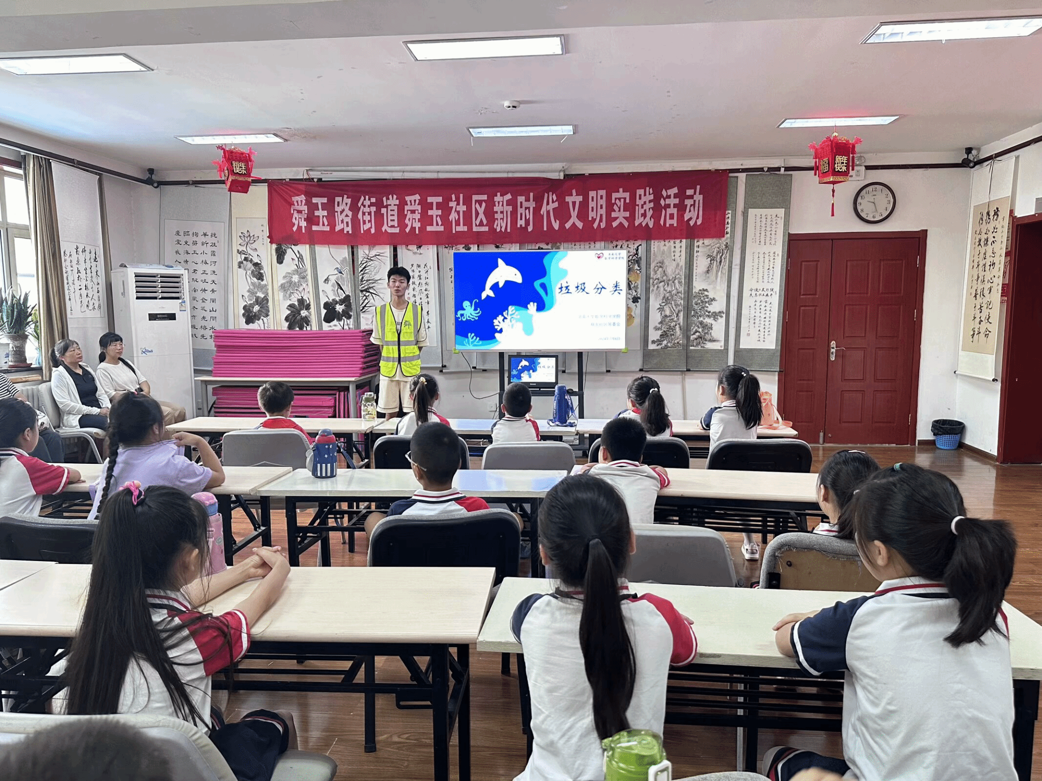 “水环泉城”水资源保护实践队于7月6日在舜玉社区开展垃圾分类主题活动,为舜玉小学的同学们讲解了有关垃圾分类的知识。