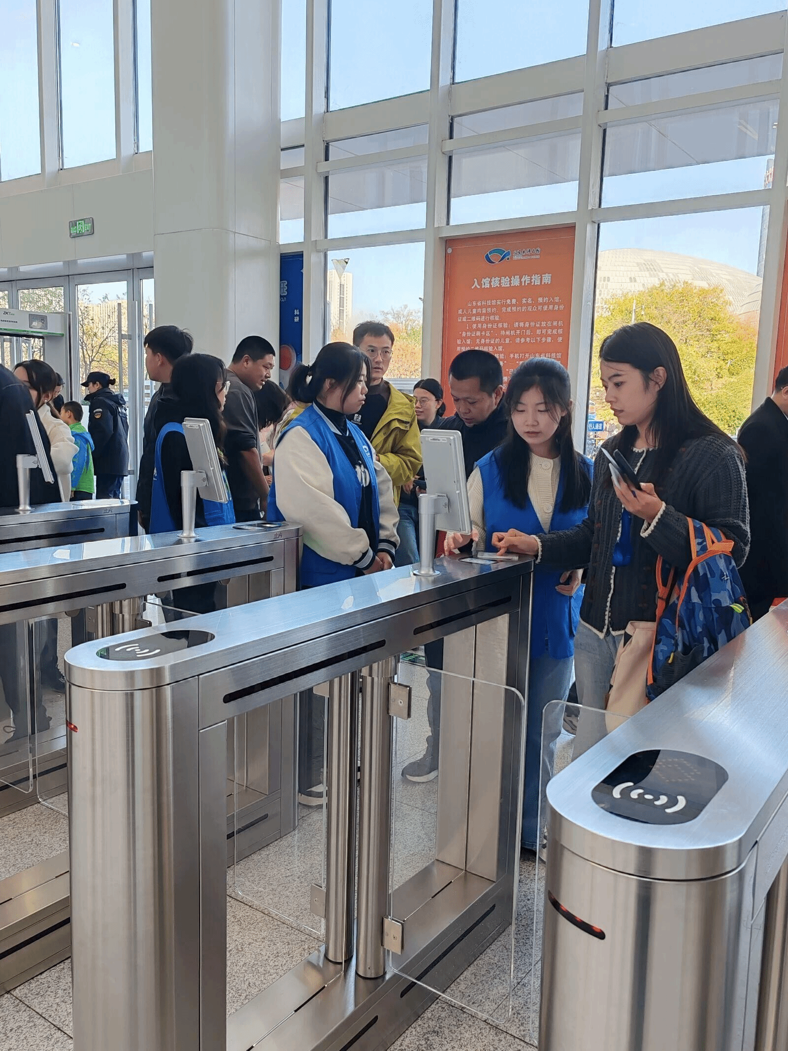 活动在科技馆工作人员的悉心指导下拉开帷幕。志愿者们身着统一的蓝色马甲,仿佛一群蓝色的精灵,在科技馆内穿梭忙碌。他们迅速熟悉各自的工作职责,以饱满的热情和积极的态度投入到志愿服务中。有的志愿者站在入口,耐心引导参观者通过小程序预约二维码和身份证有序进馆,确保场馆秩序井然,一人一码,无一遗漏;有的志愿者则穿梭在展厅之间,认真倾听参观者的需求,用热心和耐心的态度为他们解答疑惑,提供全方位的服务,让每一位参观者都能感受到温暖与关怀。
