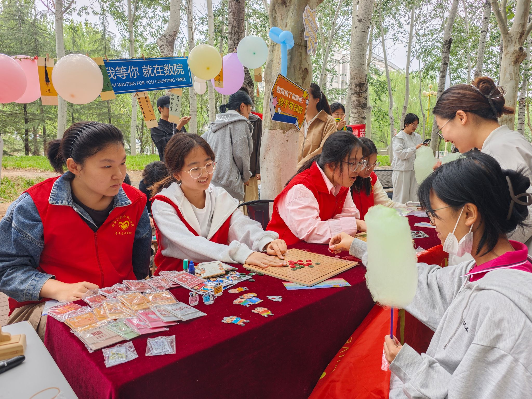 活动现场,彩色气球与趣味标语相映成趣,“我等你,就在数院”等字样传递着温暖与期待。超30项创意活动精彩纷呈,游戏挑战区,同学们全神贯注沉浸于思维与技巧的碰撞;OH卡牌体验区,一个个神秘的卡牌故事引领着同学们探索内心世界;棉花糖DIY台前,甜蜜的香气带领大家重拾儿时的纯真与快乐。志愿者们热情似火、耐心引导,可爱的玩偶在人群中穿梭互动,欢声笑语此起彼伏。集章套圈环节惊喜不断,同学们凭借智慧与运气纷纷收获精美礼品,整个现场沉浸在欢乐的氛围中。