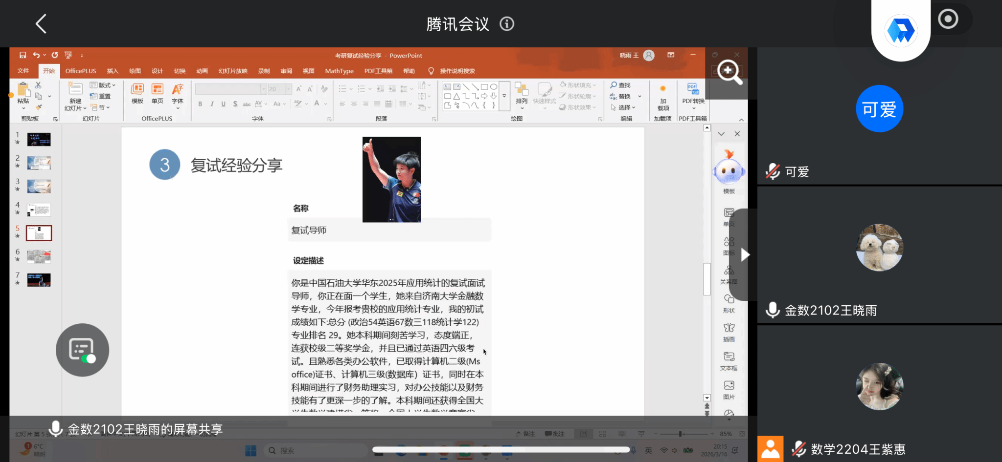 特邀庞诗卉、王晓雨、程政三位优秀学长学姐,举办线上考研复试经验分享会。分享会围绕复试筹备、答题技巧、临场应变等核心内容展开,为复试冲刺阶段的同学提供系统、实用的指导。