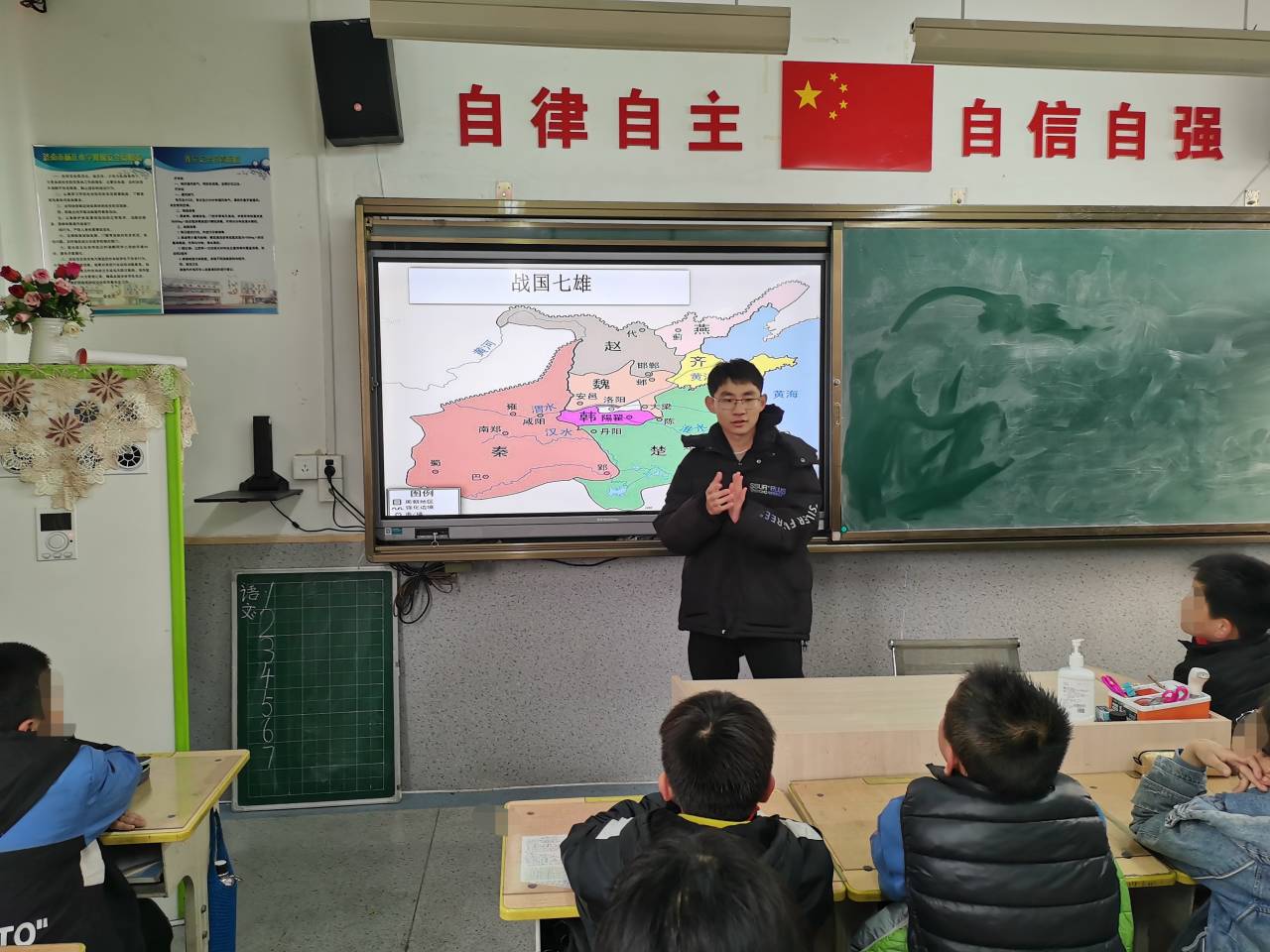 下午两点半,志愿者们准时来到杨庄小学。活动开始,志愿者们开始了紧张的课前准备。在准备结束后,讲师河豚为同学们介绍了本次的讲师团成员。课上,由历史讲师河豚通过课件引出相关内容,并对相关历史知识进行讲解,河豚讲师借助视频向同学们介绍了许多有趣的历史小故事。随堂过程中,讲师不断提出相关问题,同学们面对讲师的提问,积极踊跃地举手发言,活动通过问答的方式加深了同学们对于历史人物的了解与认识,并使课堂氛围轻松活跃。在课程的结尾,同学们就本节课所讲的相关知识给出了自己的思考并提出了全新的问题,河豚讲师统一为同学们解答困惑,使同学们对历史有了更加深入的理解。随着下课铃的响起,活动在热烈的掌声中走向尾声,同学们面带笑容,收获满满。