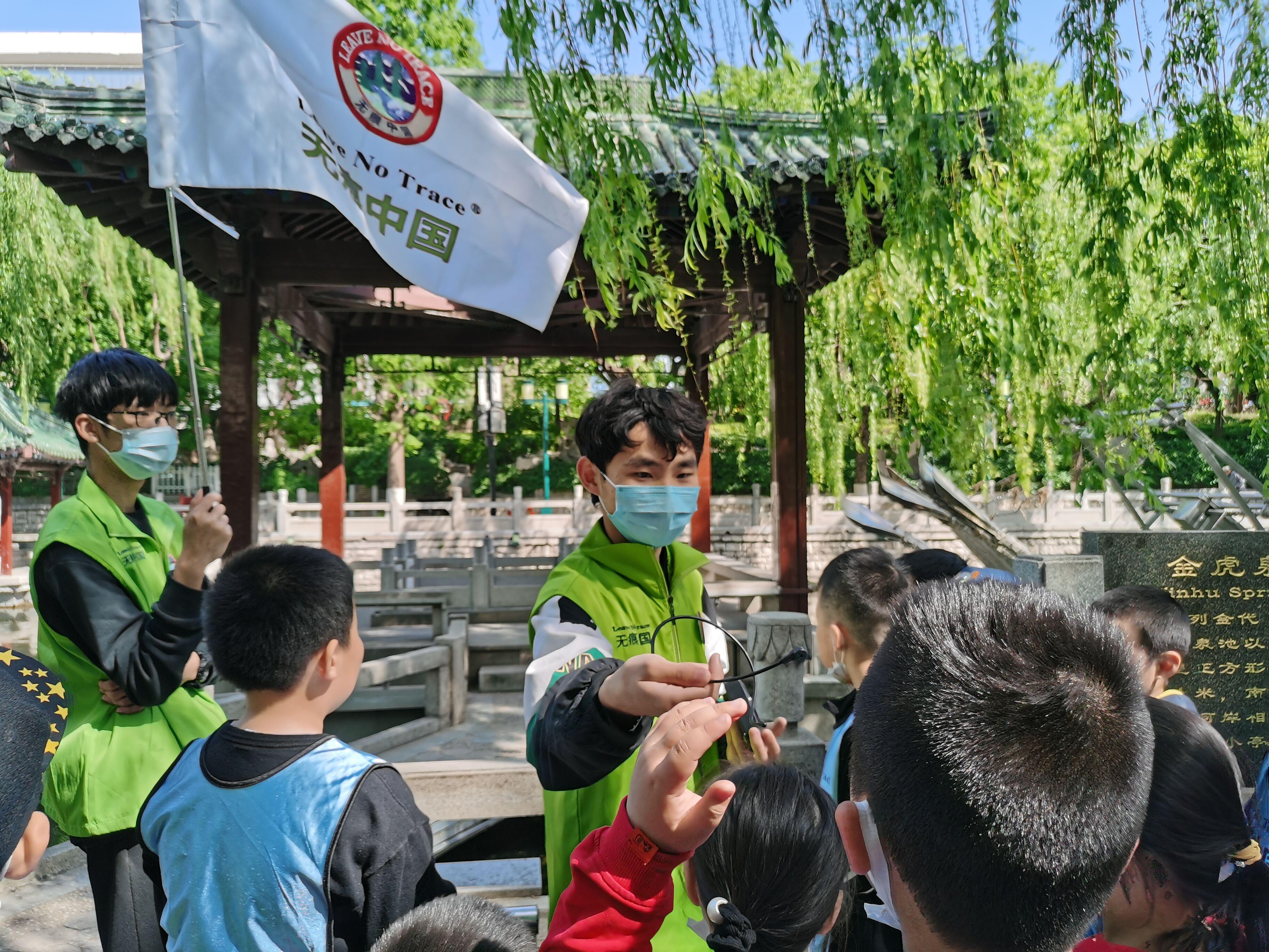 青年志愿者协会与趵突泉小学2019级2班的小朋友们于4月17日9:00在济南市黑虎泉景区组织了“无痕”环境教育活动。在此次活动中,志愿者们摇身一变,成为了为小朋友耐心讲解的小讲师。