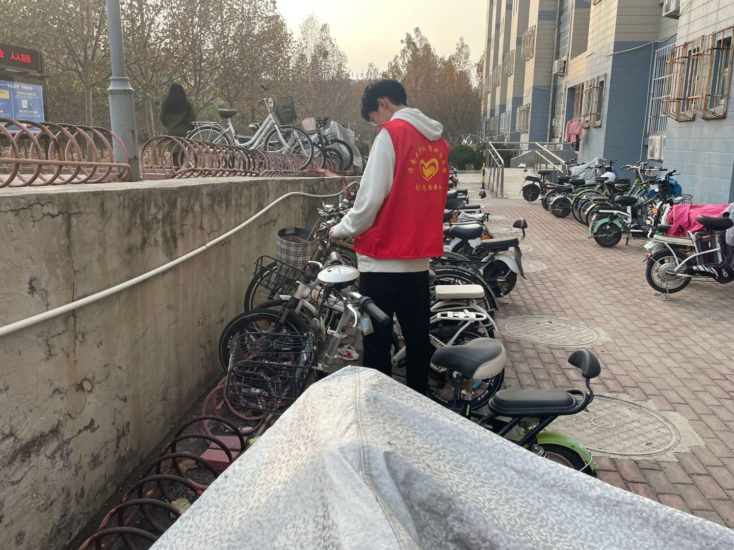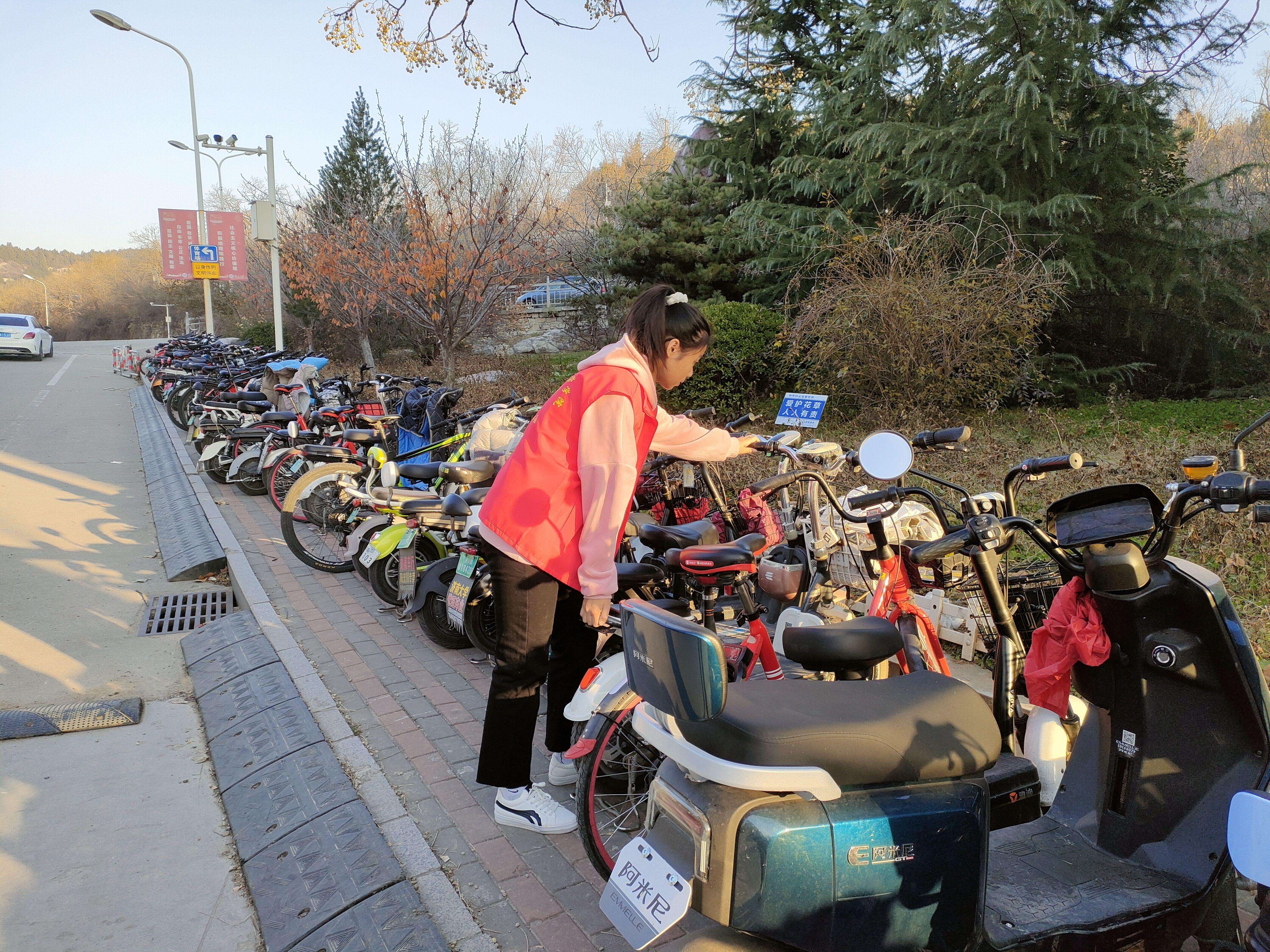 活动过程中,志愿者们将乱停乱放的电动车整齐地摆放在规定的停放区域内,并对电动车停放区域内的其他障碍物进行清理。作为文明出行的践行者、宣传者和倡导者,志愿者们在寒风中不知疲倦地开展活动,以实际行动展现出了济大学子积极奉献的志愿精神。在排车的同时,志愿者们还主动向过往同学们积极宣传文明骑行、有序停放的重要意义,倡导同学们养成文明停放的好习惯,自觉维护安全、整洁、文明、有序的校园环境。最后,在志愿者和同学们的共同努力下,校园内的电动车停放得更加有序,道路变得更加顺畅。