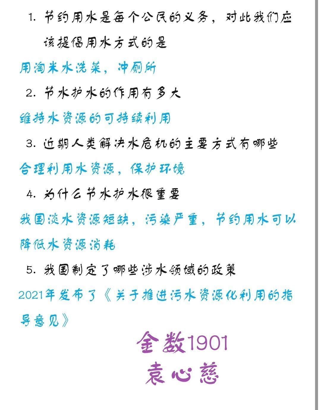 此次节水护水活动响应积极防疫的号召采用线上问答的形式展开。活动伊始,活动负责人发出问题,进而活动参与人员依据问题通过作出解答,并将答案通过手写拍照或手机打字截图的方式上传答案。作为节水护水的倡导者、宣传者和践行者,同学们积极参与,踊跃答题。在问答的同时,参与人员深刻地认识到现如今地球水资源有限的严峻形势以及水资源对于地球生物的重要作用。最后,在负责人员和参与人员的共同努力下,此次活动取得圆满成功,节水护水的理念深入人心。