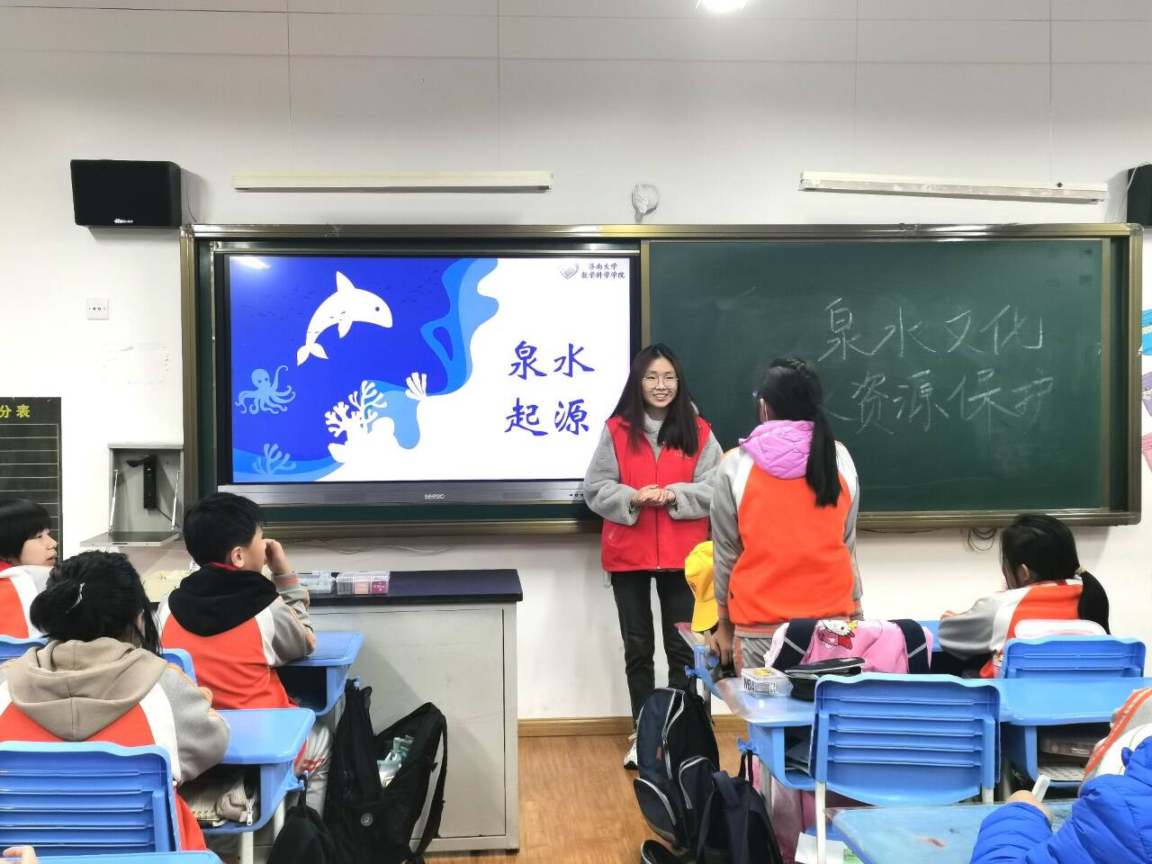活动共分为两部分。第一部分,志愿者们通过视频宣讲、PPT展示、游戏互动等方式向小朋友们讲解了济南泉水的形成原因以及泉水的发展历史,小朋友们纷纷举手发言,讲出了他们心中的泉城文化,通过这种方式让小朋友们充分领悟到了“齐多甘泉,甲于天下”的内涵。之后,志愿者们围绕我国水资源现状、泉水资源受到的威胁进行视频讲解,加深了小朋友们对环境保护的理解,让小朋友认识到水资源保护刻不容缓。