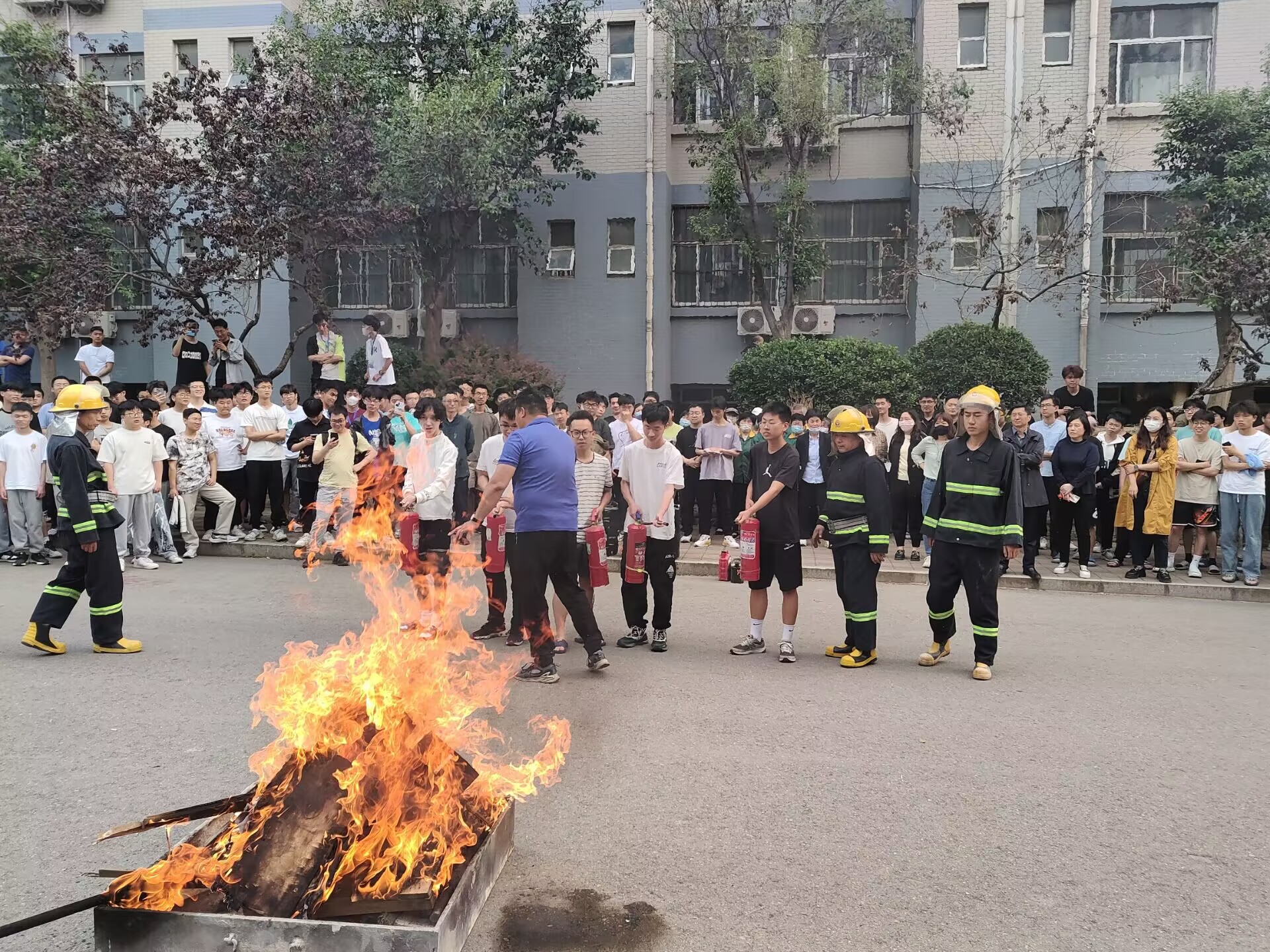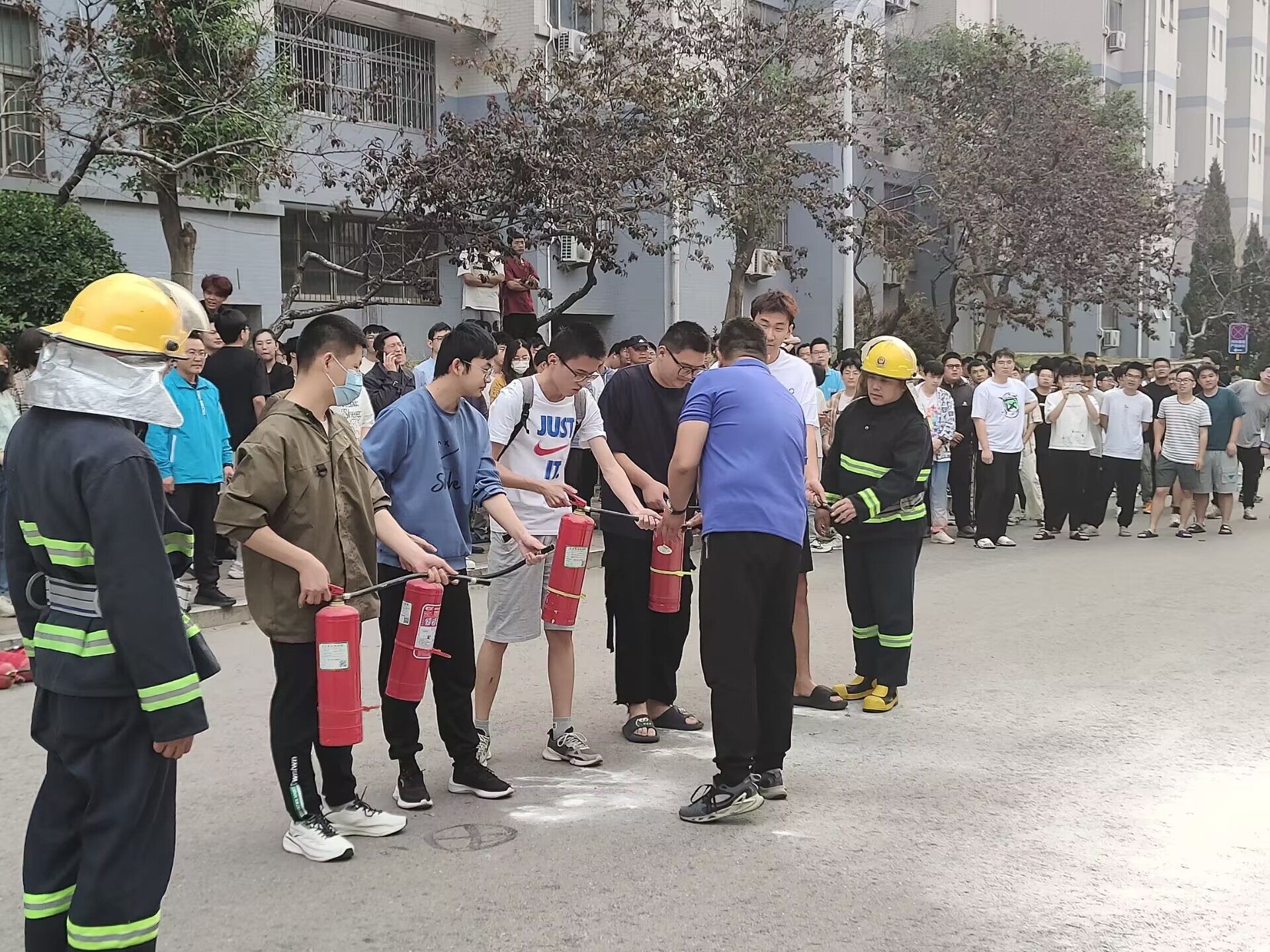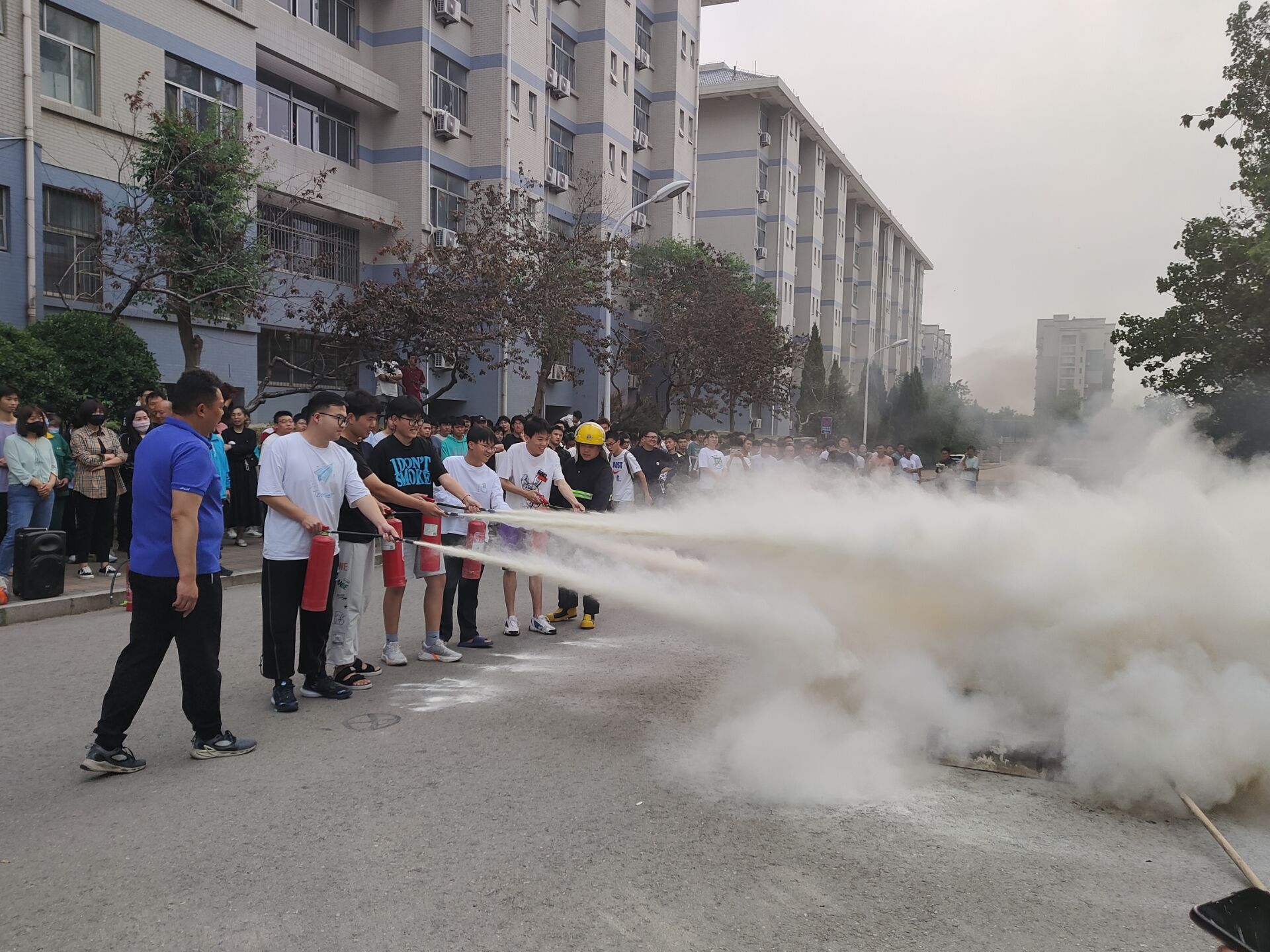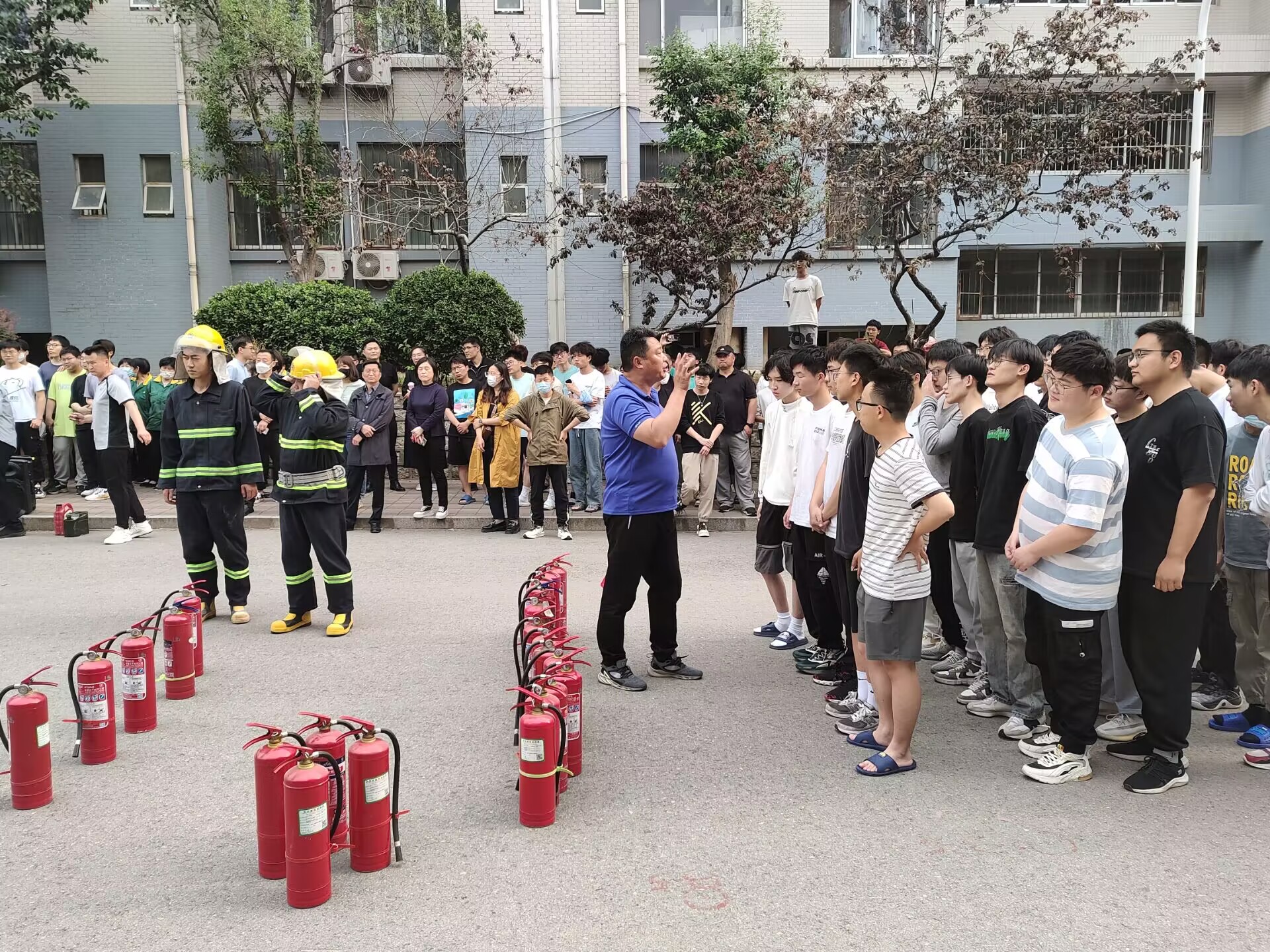 安全处主任丁立波老师对此次演练进行了点评,并对同学们安全有序的撤离提出了表扬。随后消防支队的消防员们对如何使用干粉式灭火器进行了规范的教学,并邀请学生代表进行了实操演练,使同学们更好地掌握了使用灭火器的方法。