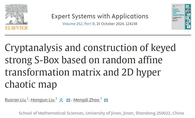 2. 题为“Cryptanalysis and construction of keyed strong S-Box based on random affine transformation matrix and 2D hyper chaotic map”的研究论文(//doi.org/10.1016/j.eswa.2024.123933),研究生刘若冉为第一作者,刘红军副教授为研究生导师兼通讯作者,研究生赵梦迪为第三作者。