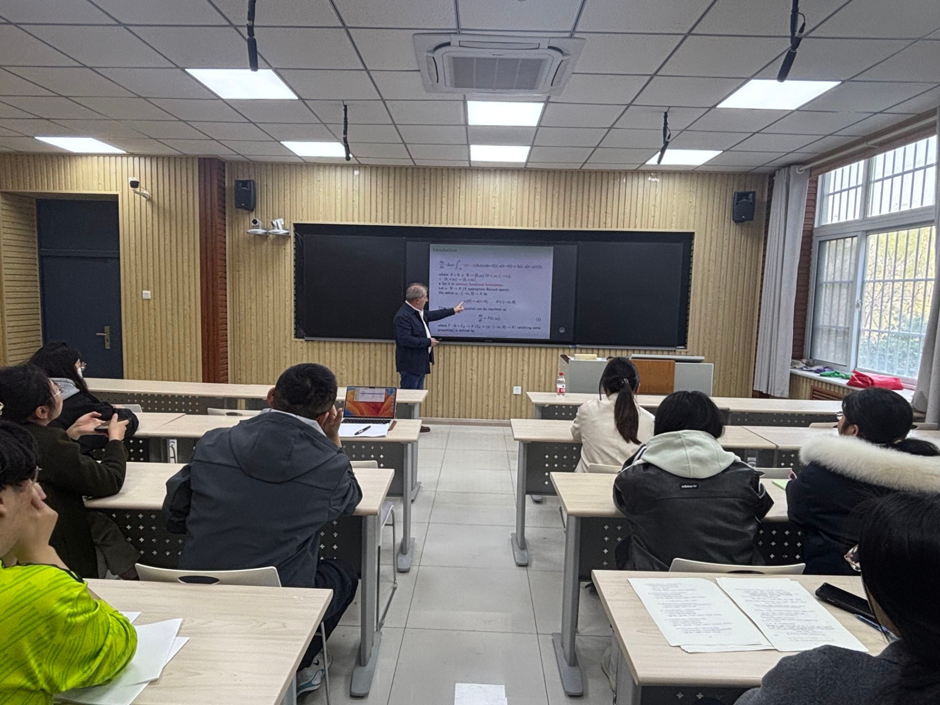 报告中,Tomás Caraballo教授围绕比例微分方程生成的动力系统展开了阐述。Tomás Caraballo教授介绍了包含不同类型的时滞和记忆项的方程的渐近动力学行为以及该领域最新的研究成果,重点阐释了利用半群方法和构造比例时滞的变换方法研究IVP解的存在性,深入浅出地分析了比例时滞微分方程解的适定性和长时间行为。报告会后,Tomás Caraballo教授与参会师生进行了热烈的互动交流,就大家提出的专业问题给予了细致耐心的解答。Tomás Caraballo,西班牙塞维利亚大学终身教授,博士生导师,美国奥本大学客座教授。主要研究领域是随机偏微分方程和泛函微分方程。先后在Comm. PDE, SIAM J. Math. Anal., J. Differential Equations, Proc. AMS, J. Dynam. Differential Equations, SIAM Appl. Dyn. Syst.等数学权威期刊上发表论文三百四十余篇,并著有《Applied Nonautonomous and Random Dynamical Systems, Applied Dynamical Systems》,多次受邀在华中科技大学、华南理工大学,西北大学、东华大学等学术访问并做报告。