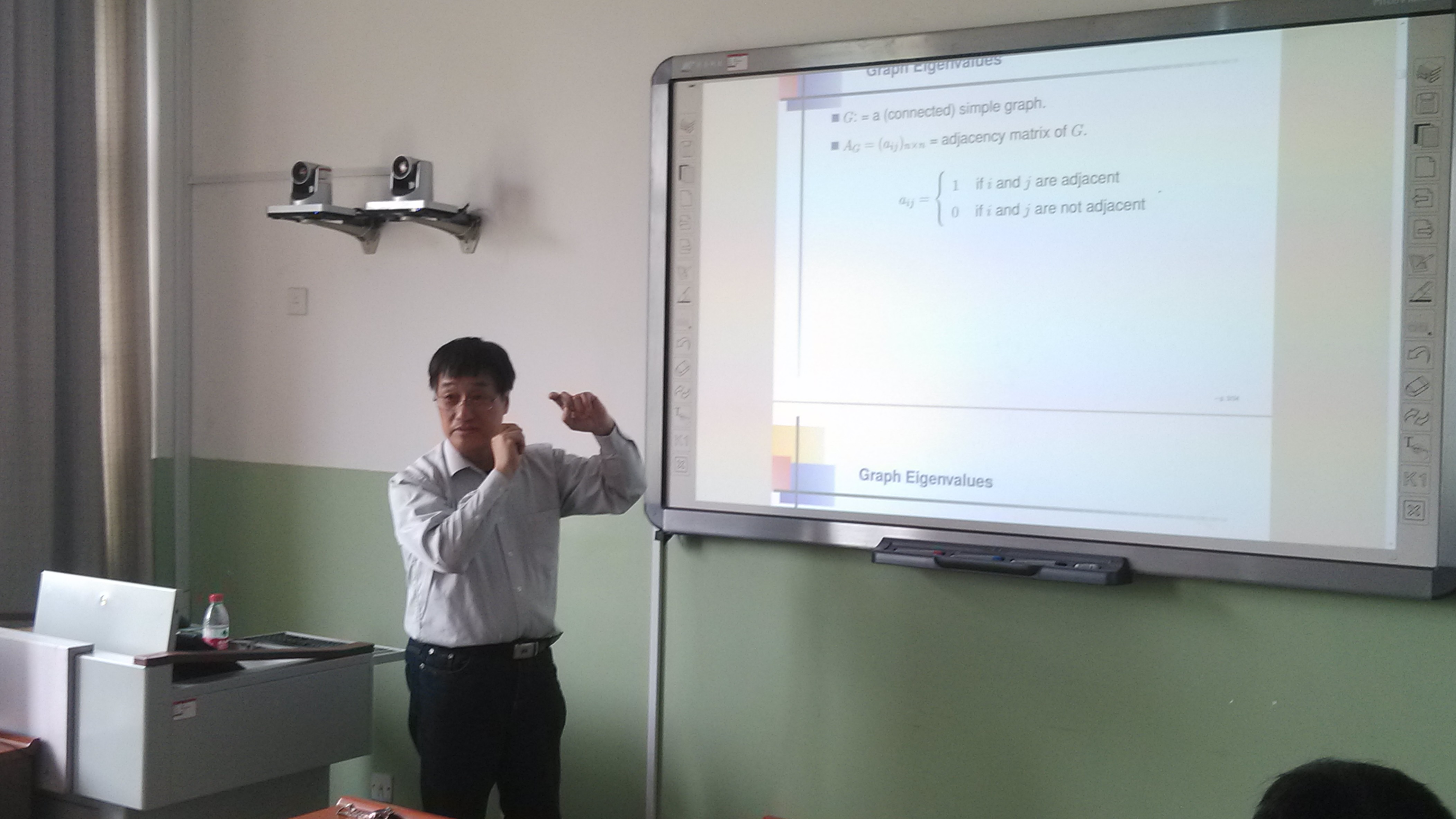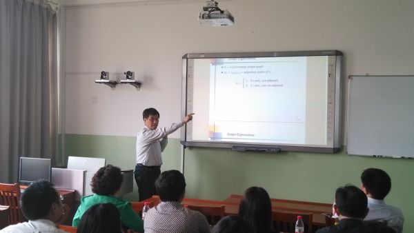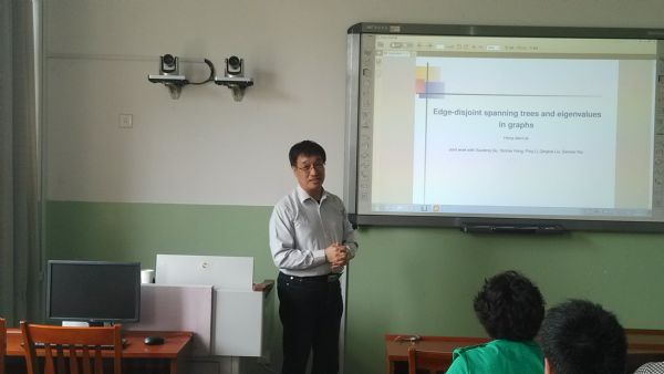 报告会上,赖虹建教授做了《图的边不交的支撑树与特征值》的报告。赖虹建教授从“图的边不交支撑树的个数与邻接矩阵特征值之间关系”的一个猜想出发,介绍了图的邻接矩阵、拉普拉斯矩阵和无符号拉普拉斯矩阵的概念和相关组合、代数方法,详细讲解了问题的研究思路和主要结果,并提出了进一步思考的一些问题。会后,娱乐城App