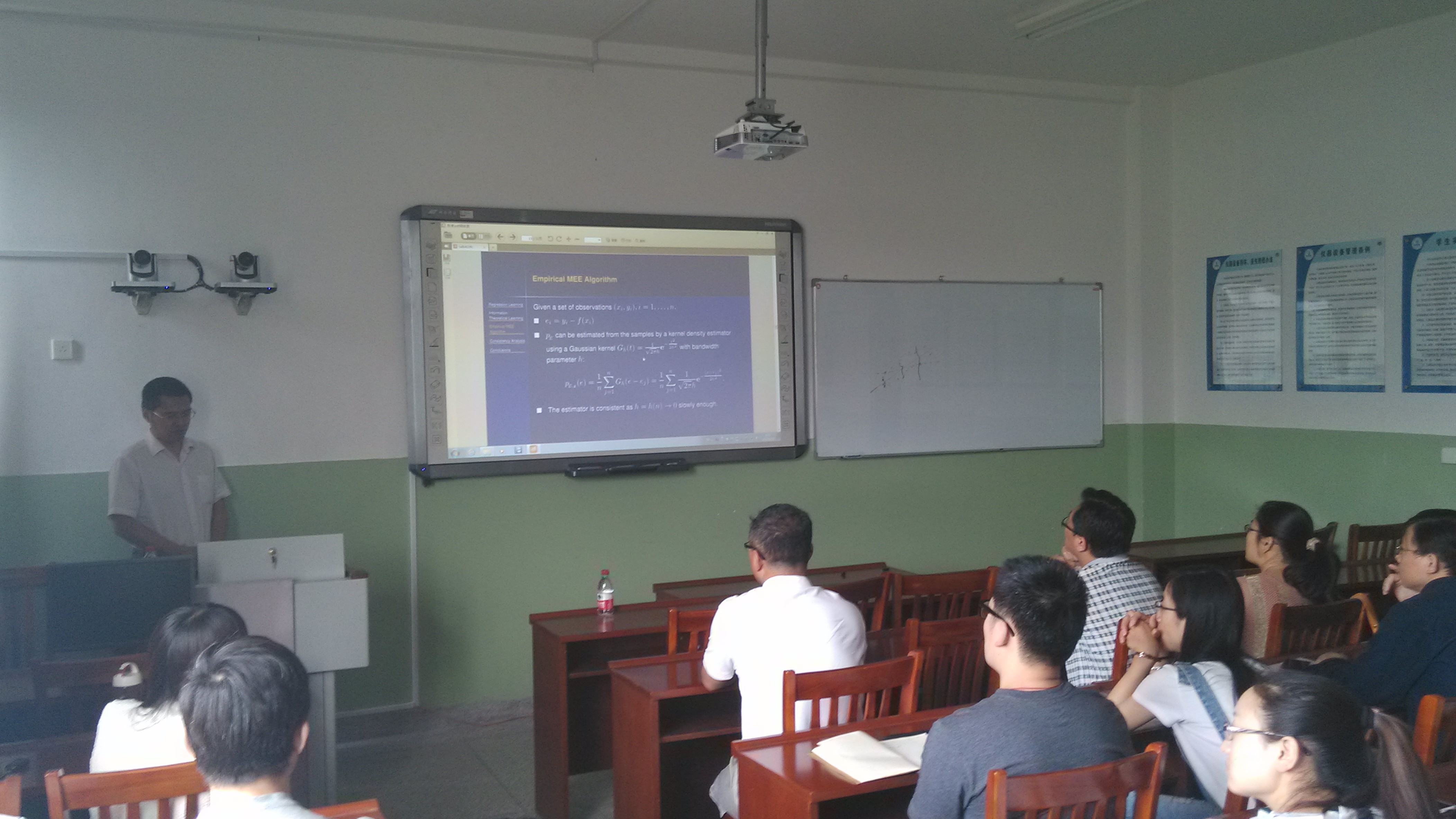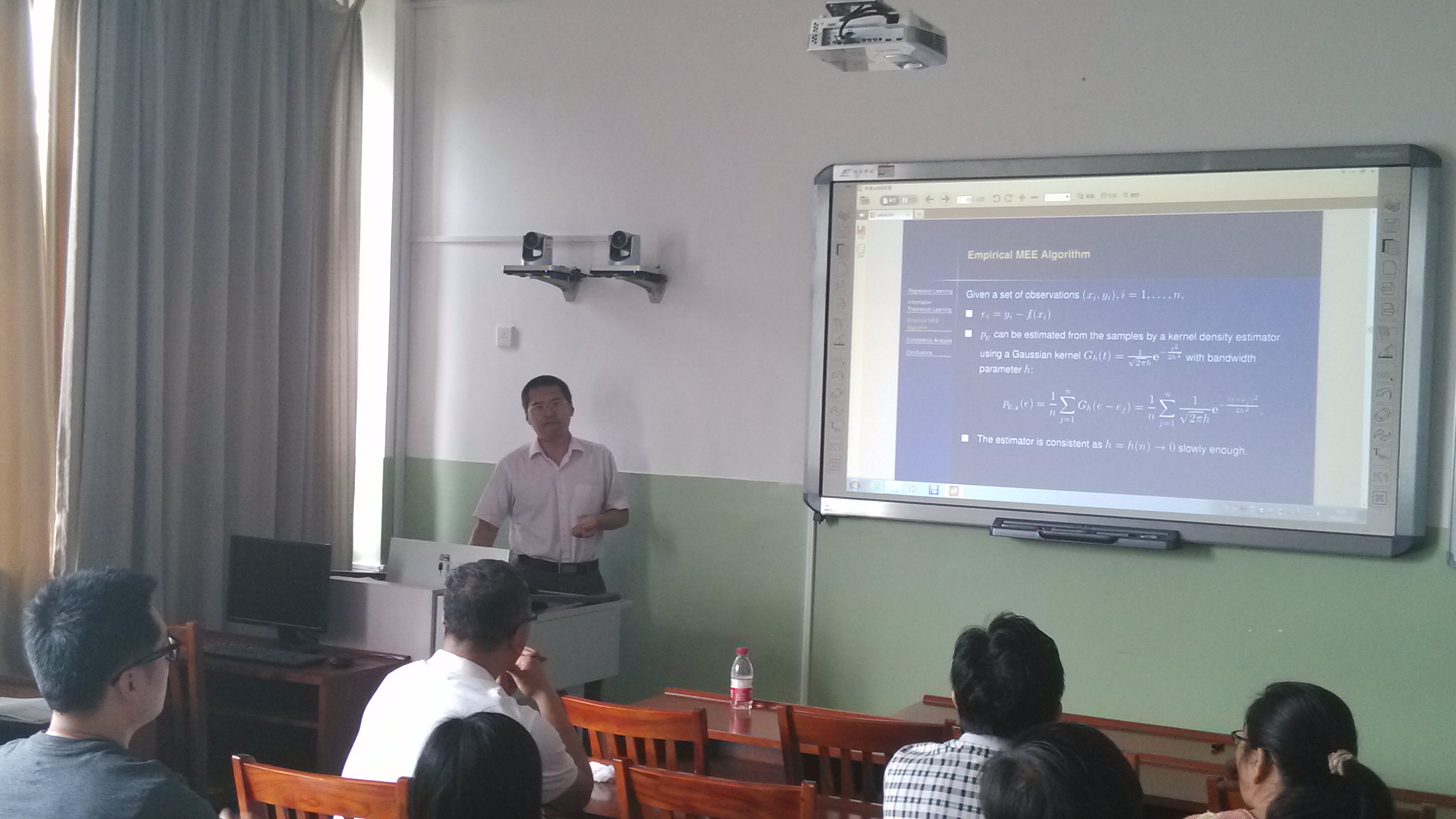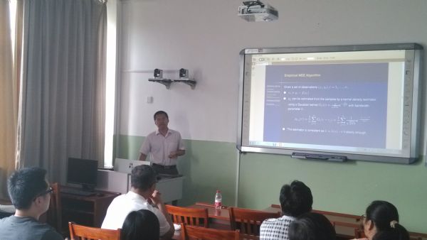 吴强博士的报告题目为《Consistency Analysis of the Minimum Error Entropy Algorithm》。报告中,吴强博士详细介绍了回归学习、基于信息论中Shannon熵与Renyi熵的MEE回归算法的由来、以及MEE回归算法的一致性分析,并提出了进一步思考的一些问题。会后,娱乐城App