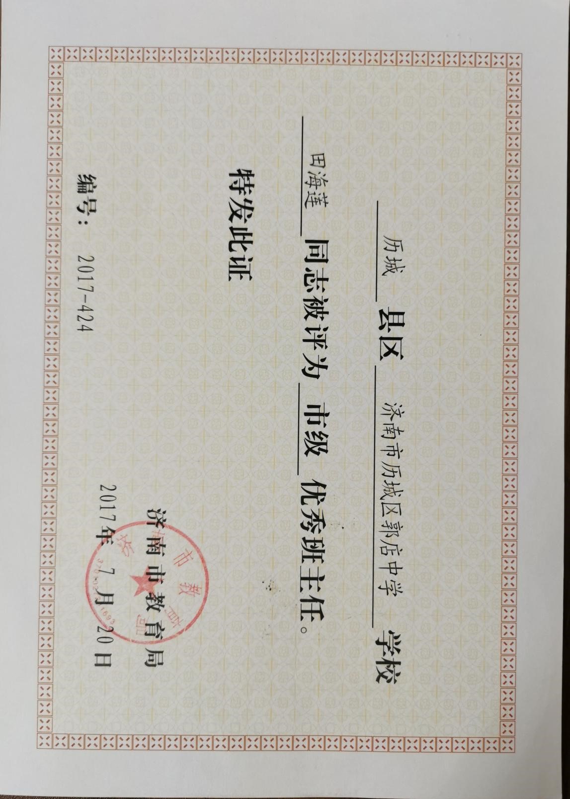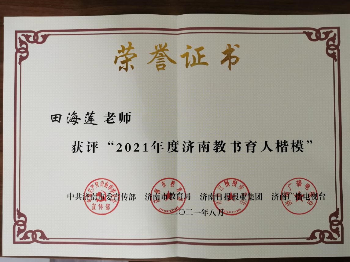 每当我接手一个班集体,我都会告诉同学们我最看重的是人品,一撇一捺把人做好,才能在社会上立足。我们一定要弘扬社会主义核心价值观,做对社会有贡献的人。同学们都说我是真正让他们喜欢的老师。所带班级班风正,学生们都是满满的正能量。2013年5月所带班级被评为“济南市优秀班集体”。2014年我被评为“历城区政府优秀班主任”。2017年被评为“济南市优秀班主任”。