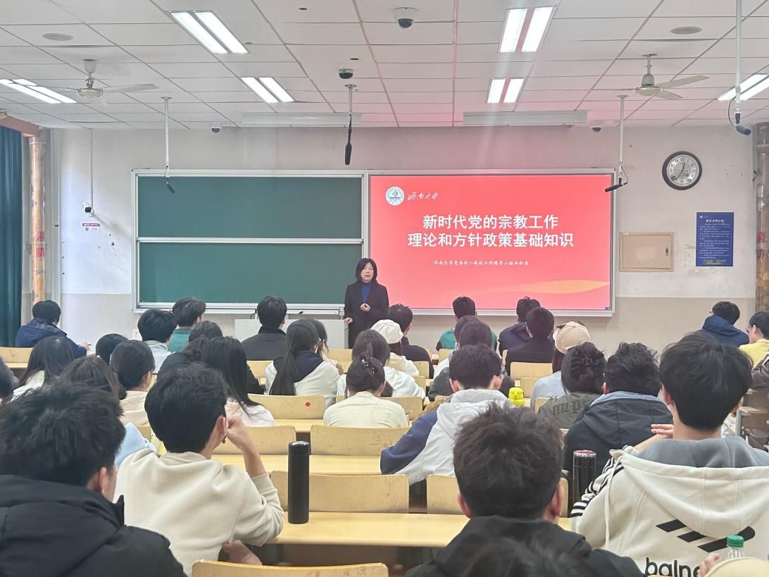 为深入学习贯彻习近平总书记关于宗教工作重要论述精神,帮助学生党员和入党积极分子准确把握新时代党的宗教工作理论和方针政策,切实提升思想政治素养和辨别是非能力,11月5日,娱乐城App 在第十教学楼104室举行新时代党的宗教工作理论和方针政策专题宣讲活动。娱乐城App 党委统战部副部长刘鑫出席并做专题宣讲,娱乐城App 党委书记崔英静,党委副书记、副院长张沂红及部分学生党员、入党积极分子共计100余人参加活动。